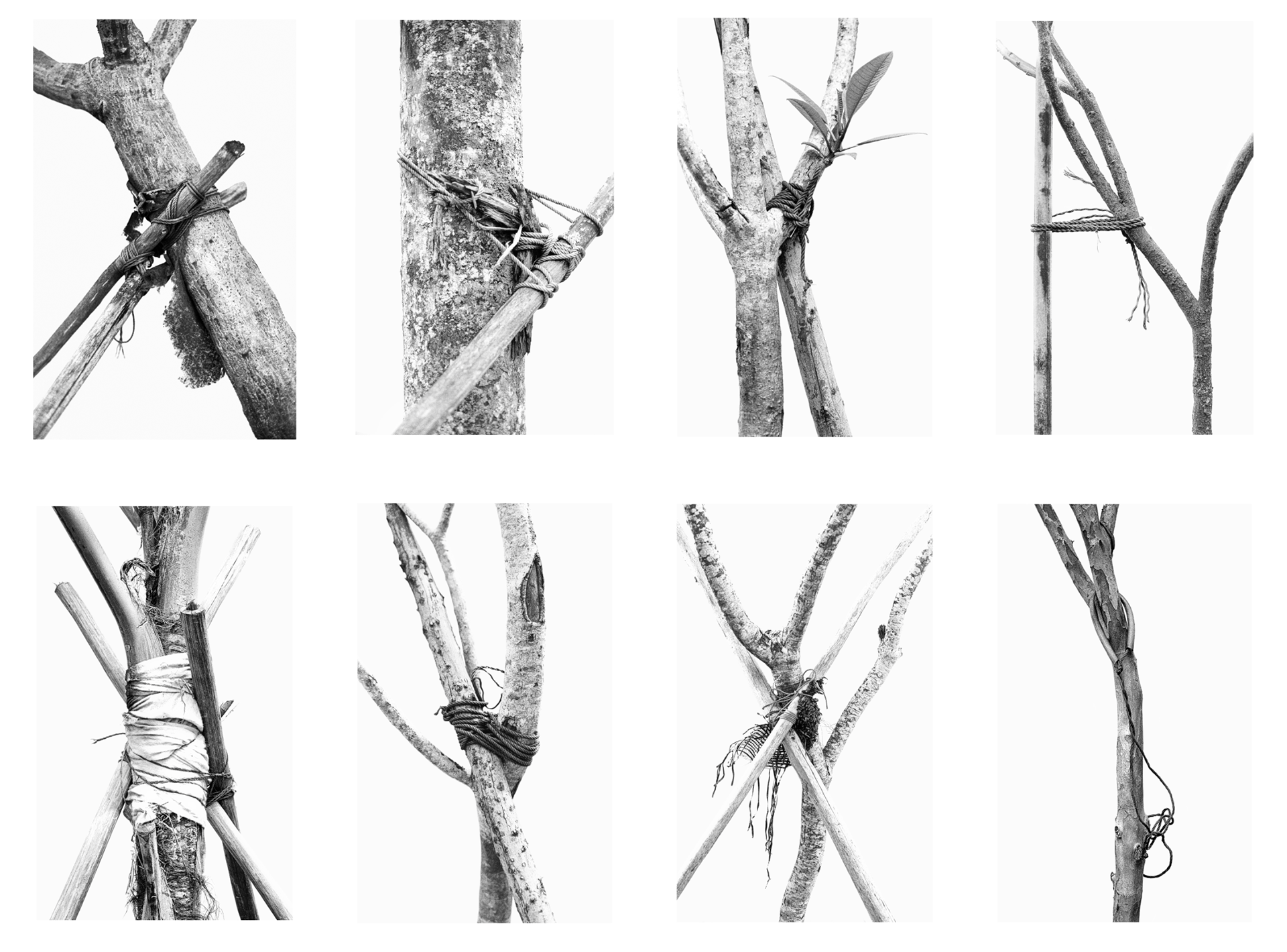 Between August and December 2015, Woong Soak Teng explored the man-made garden city of Singapore and made portraits of its staked trees. As in many cities around the world, here trees are uprooted and relocated to conform to a controlled cityscape determined by urban planning. As part of an attempt to construct productive and aesthetic living environments for ourselves, nature has long since been subjected to manipulation at the mercy of human hands.
